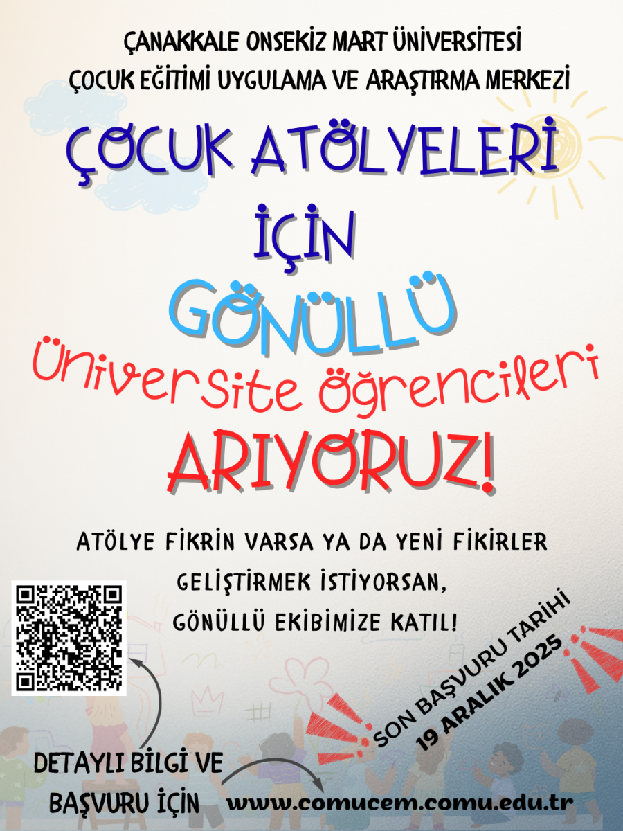 Bu atölyelerde görev alacak, çocuklarla çalışmaya istekli, üretken, sorumluluk sahibi ve farklı branşlardan gönüllü üniversite öğrencilerini merkezimize davet ediyoruz.