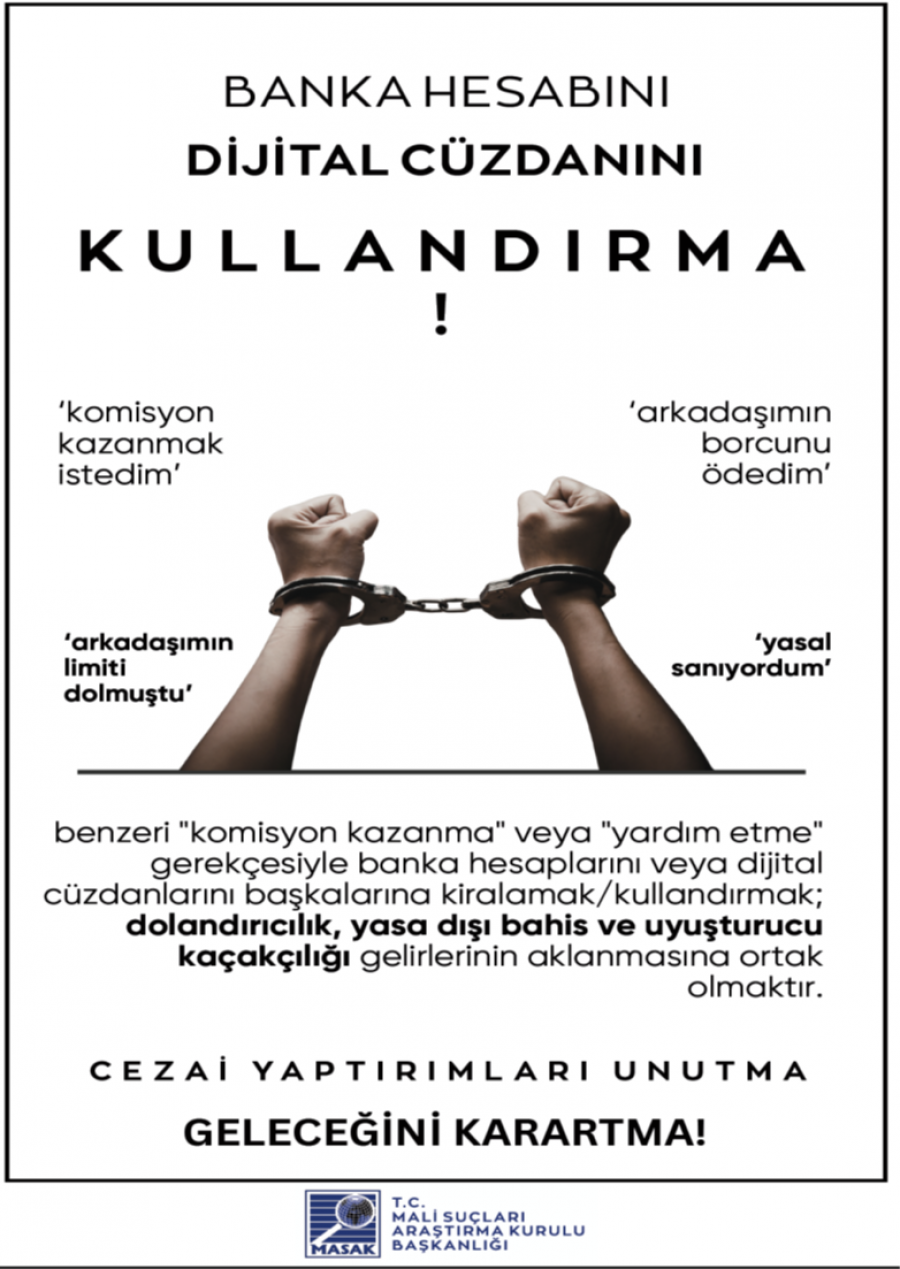 Kendi adınıza kayıtlı banka hesaplarınızın veya dijital cüzdanlarınızın; “komisyon kazanma”, “borç ödeme yardımı”, “sadece bir kez kullanma”, “zararsız para transferi” veya benzeri gerekçelerle başkaları tarafından kullanılmasına bilerek ve isteyerek izin verilmesi, Türk Ceza Kanunu ve ilgili mevzuat kapsamında cezai ve hukuki sorumluluk doğurabilir. Hesaplarınız üzerinden gerçekleştirilen işlemlerden, işlemi fiilen yapan kişi kim olursa olsun, hesap sahibi olarak siz sorumlu tutulabilirsiniz.