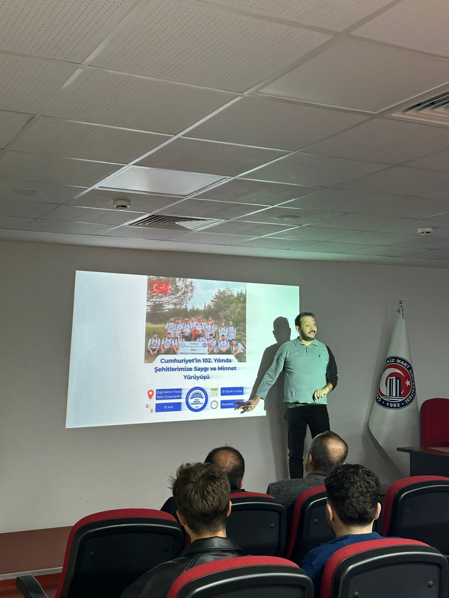 Cumhuriyetimizin 102. yılı kapsamında düzenlenecek “Şehitlerimize Saygı ve Minnet Yürüyüşü” öncesinde, yürüyüşe katılacak öğrencilerimize yönelik “Doğada Yürüyüş Esnasında Uyulacak Kurallar Eğitimi” gerçekleştirildi.